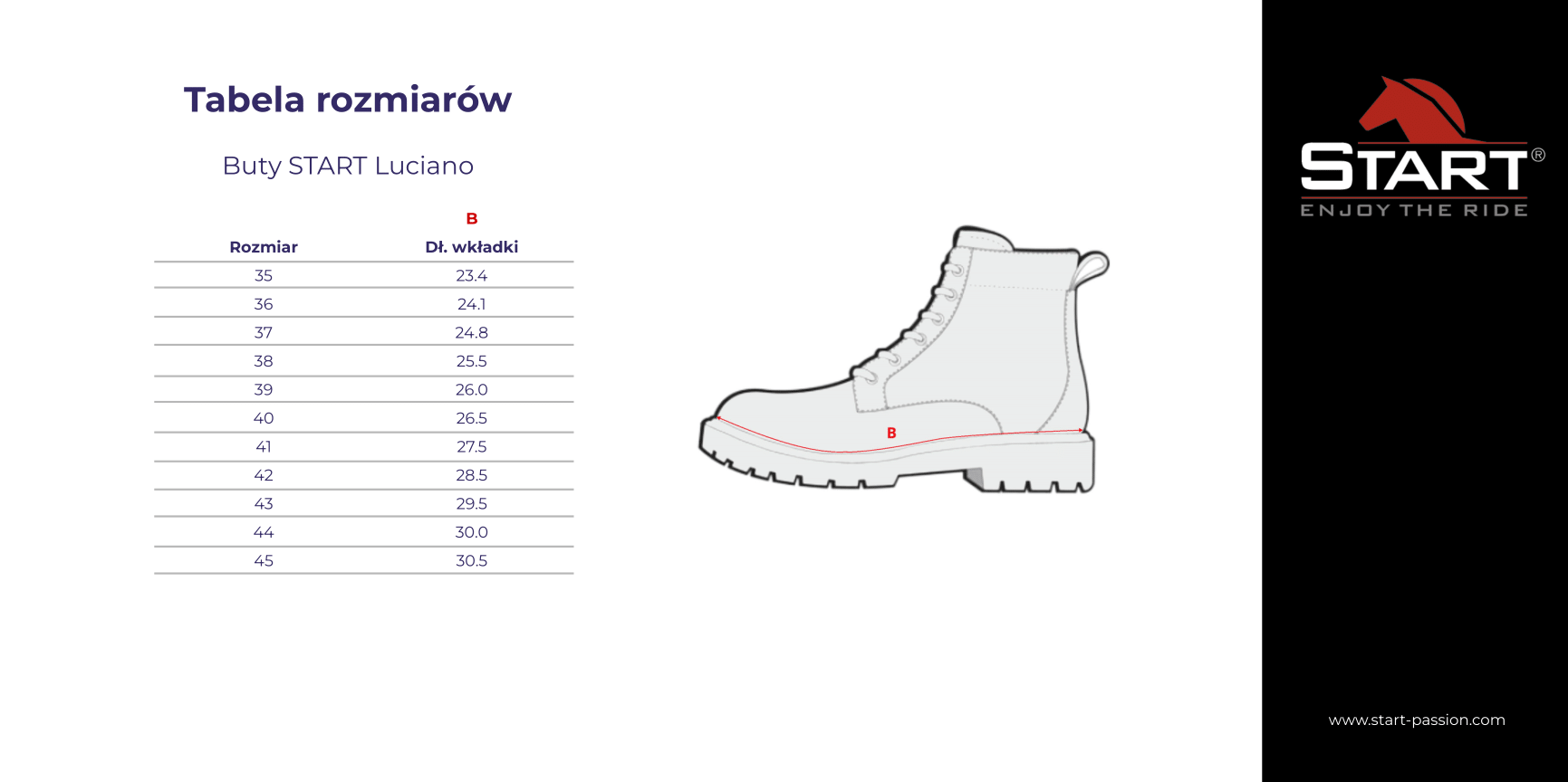 Klasyczny kolor, wysoka jakość wykonania oraz dopracowane detale sprawiają, że buty stajenne START Luciano to uniwersalny wybór dla osób, które oczekują trwałości, wygody i sprawdzonych rozwiązań w wyborze jeździeckiego obuwia.